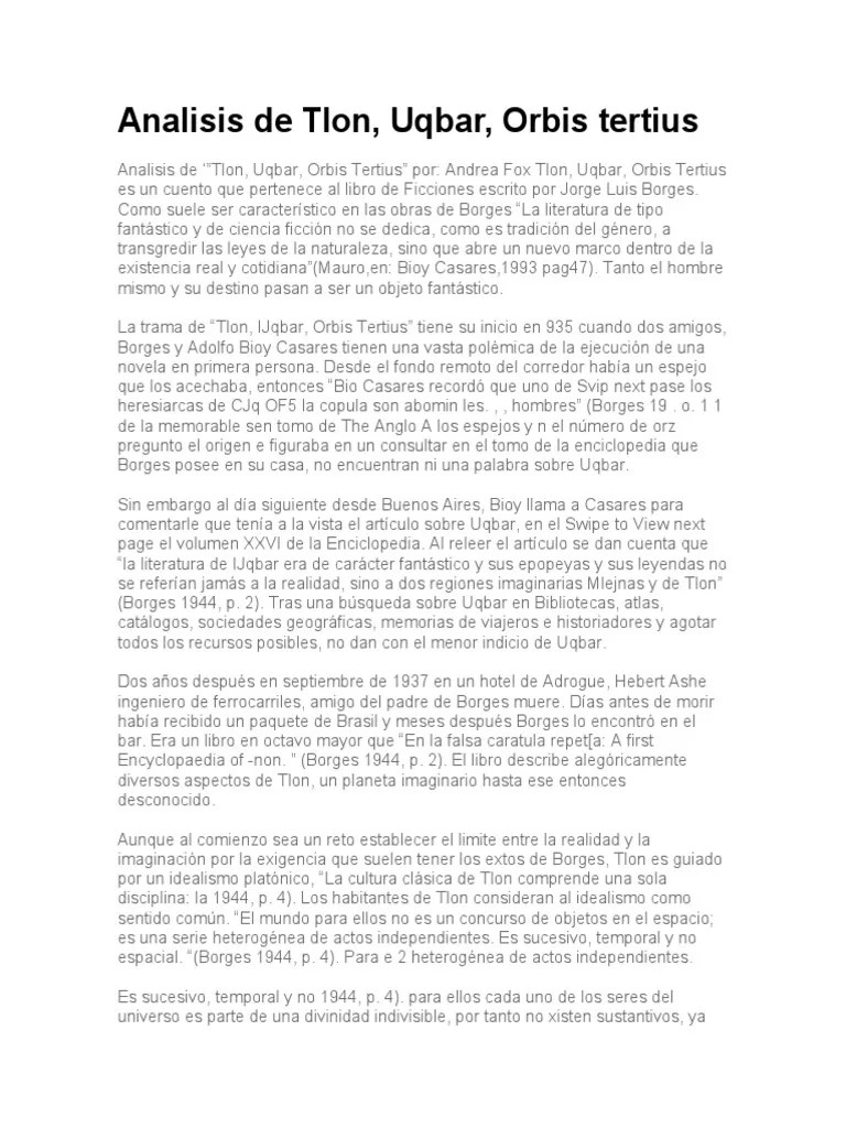 Andrea fox tlon, uqbar, orbis tertius es un cuento que pertenece al libro de ficciones escrito por jorge . Me da un poco de vergüenza que . La presente investigación reconstruye el universo de sentidos presentes en el cuento tlön, uqbar, orbis tertius de jorge luis borges a través .